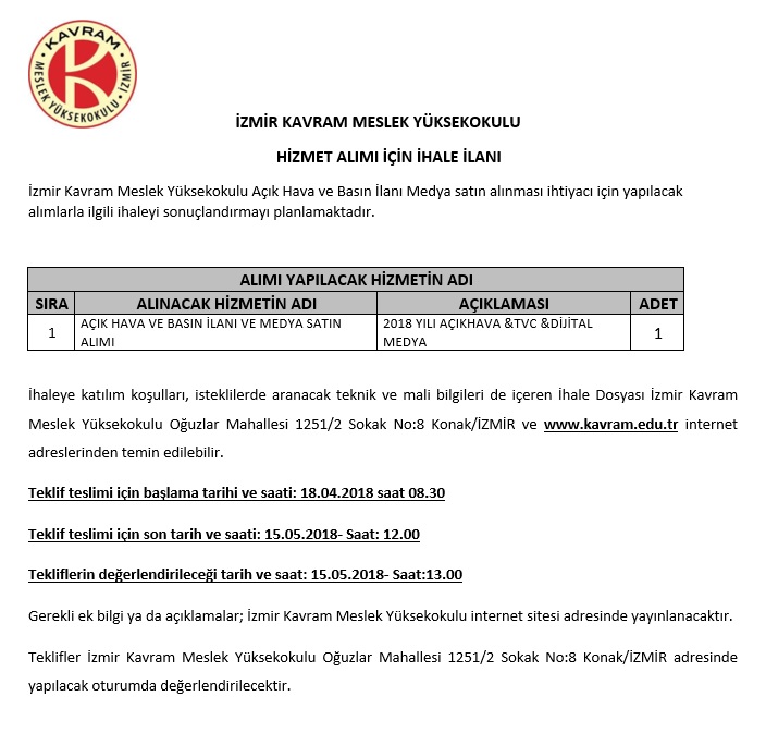 Açık Hava ve Basın İlanı Medya Hizmeti Satın Alınması İhalesi Hk. (18.04.2018)