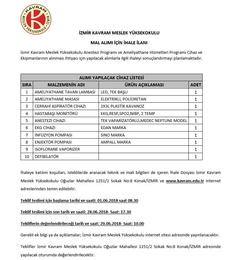 Anestezi Programı ve Ameliyathane Hizmetleri Programı Cihaz ve Ekipmanlarının alınması İhalesi Hk. (01.06.2018)