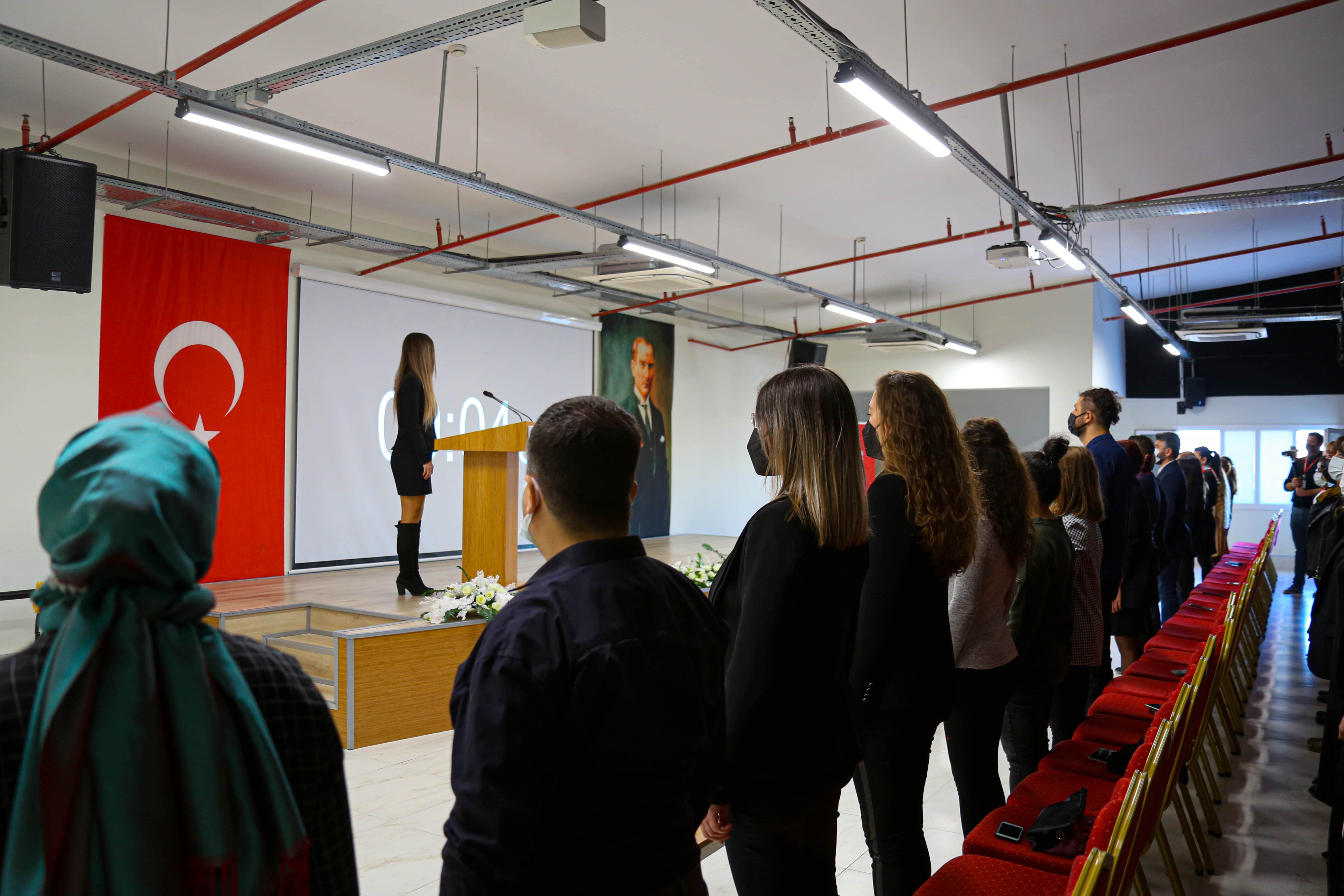 Siren sesleriyle dokuz’u beş geçe başlayan törende saygı duruşu, istiklal marşı ve ardından Adalet Programı Öğretim Görevlisi İmge Kuzgun’un konuşması yer aldı.