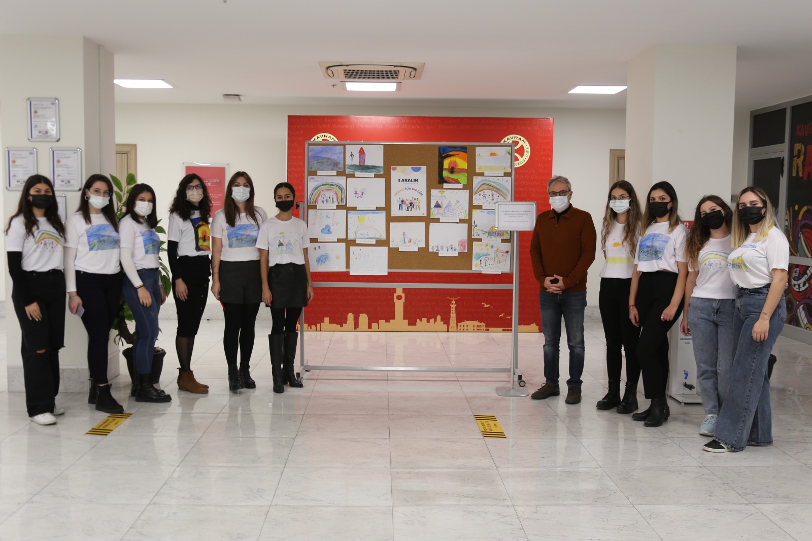 İzmir’de bulunan Özel Eğitim ve Rehabilitasyon Merkezinde eğitim gören özel gereksinimli bireylerin çizmiş oldukları resimler meslek yüksekokulumuz fuaye alanında sergilendi. Aynı zamanda özel gereksinimli bireylerin çizmiş oldukları resimlerden tişört baskısı yapıldı ve çocuk gelişimi programı öğretim görevlileri ile program öğrencileri tişörtleri giyerek farkındalık yarattılar.