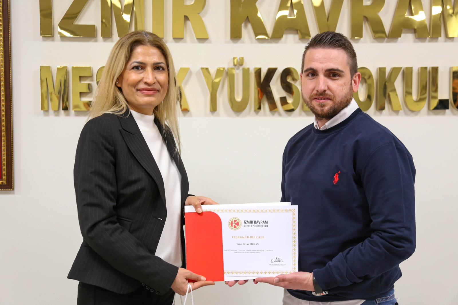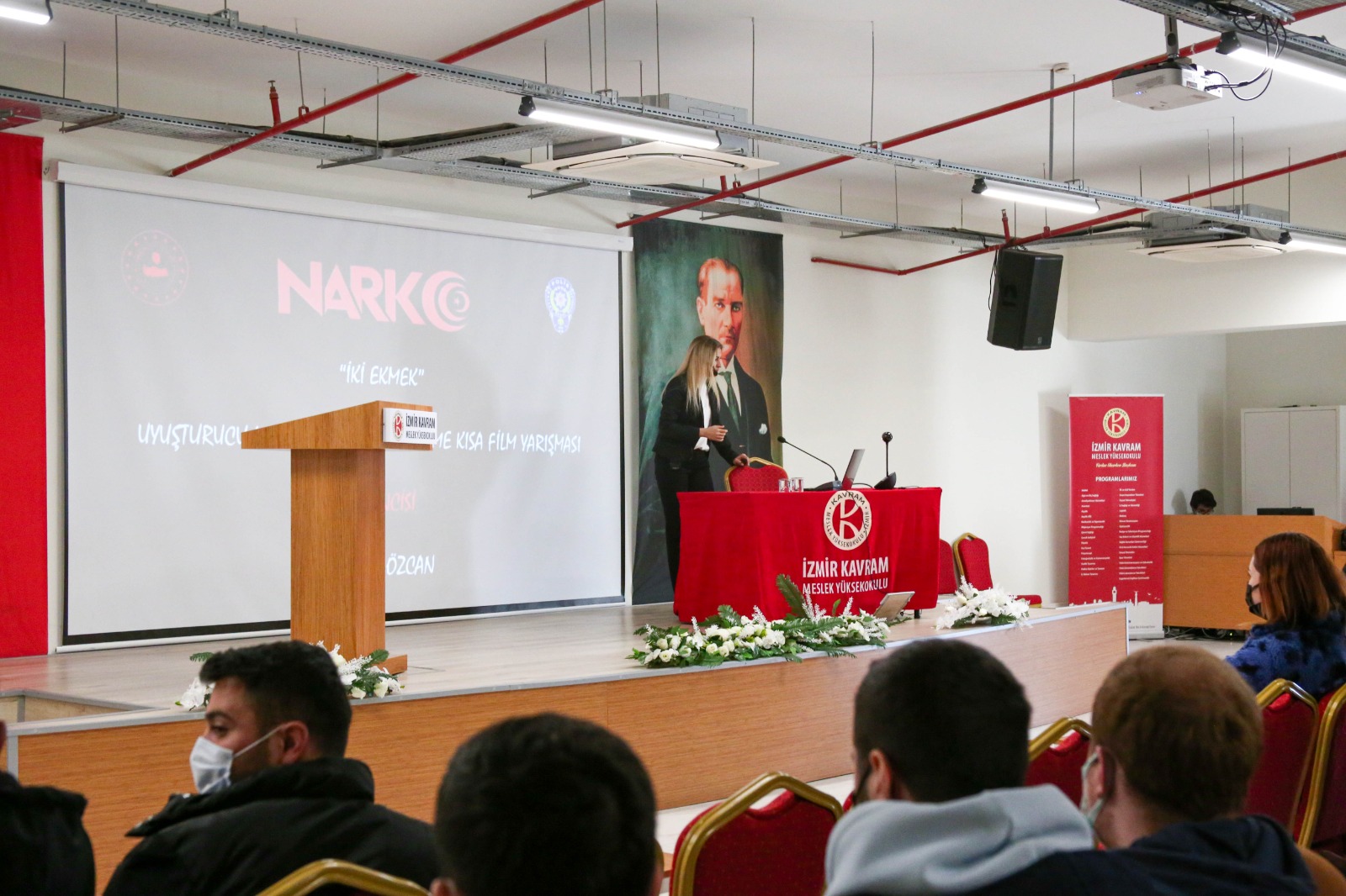 Yükseköğretim Kurulu’nun Bağımlılıkla Mücadele Eylem Planı çerçevesinde Meslek Yüksekokulu Müdürlüğümüz tarafından organize edilen ve İzmir İl Emniyet Müdürlüğü İzmir Narkotik Suçlarla Mücadele Şube Müdürlüğü tarafından gerçekleştirilen “Gençlere Yönelik Madde Bağımlılığı” konusunda öğrencilerimize yönelik farkındalık eğitimi gerçekleştirildi. Eğitim sonunda Yüksekokul Müdür Yardımcımız Sn. Öğr. Gör. Aykut AKSU, eğitimci konuğumuz Sn. Bircan BİRKAN'a teşekkür belgesi takdim etti.
