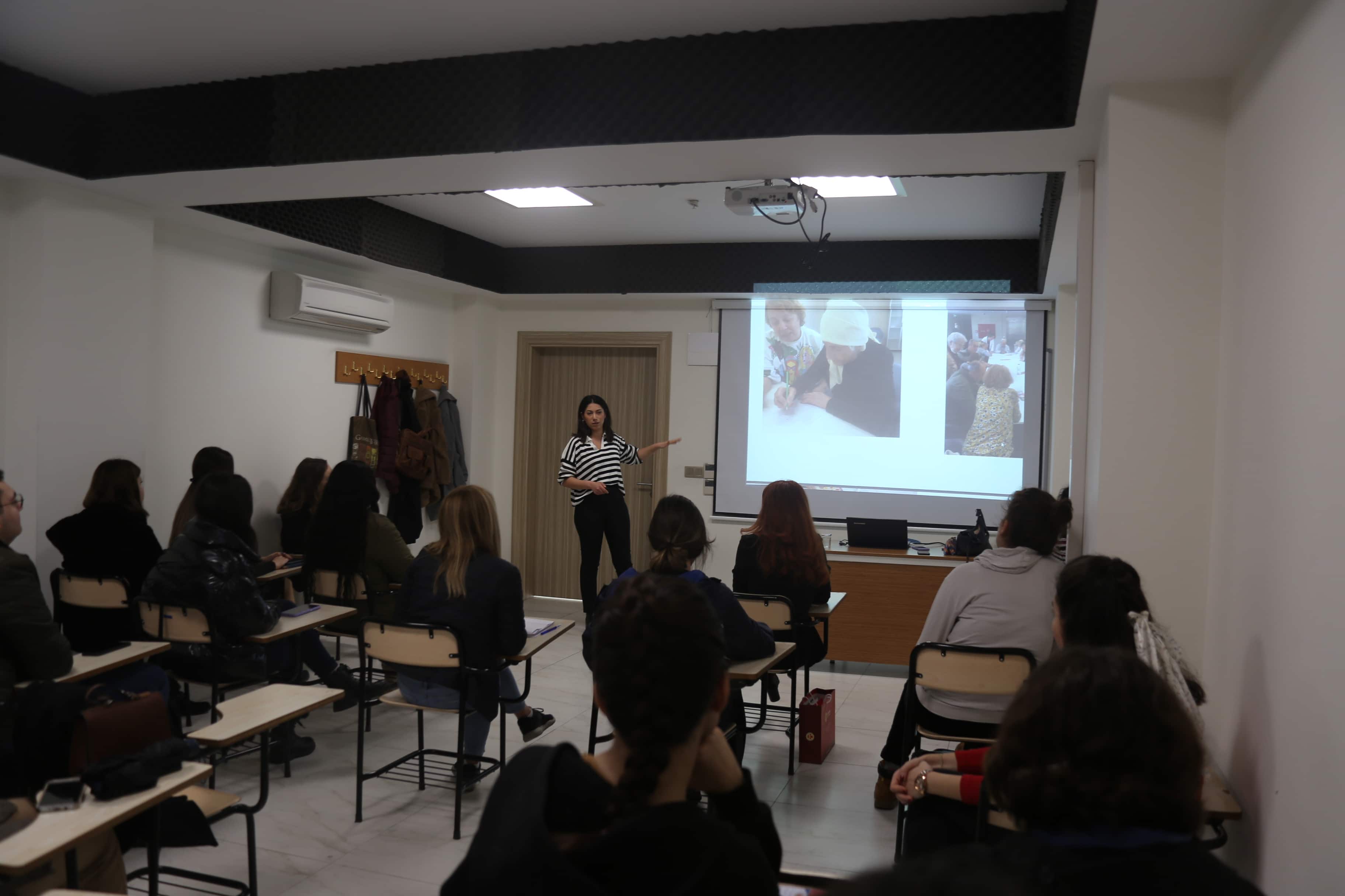 İzmir Kavram Meslek Yüksekokulu Sosyal Hizmetler Programı tarafından Kariyer Dönemi Etkinlikleri kapsamında “Yerel Yönetimlerde Yaşlılara Yönelik Hizmetler; Karşıyaka Belediyesi Gündüz Yaşam Merkezi Örneği” isimli etkinlik, merkezde görevli Sosyal Hizmet Uzmanı Hazal Bayram Efe’nin katılımıyla gerçekleştirildi. Program öğrencilerinin yoğun ilgiyle takip ettiği etkinlikte; Karşıyaka Belediyesi tarafından, Türkiye Alzheimer Derneği İzmir Şubesi ve Ege Geriatri Derneği iş birliğinde yeni açılmış olan ve Alzheimer hasta ve hasta yakınlarının yaşam kalitelerini artırmaya yönelik tıbbi, psikolojik ve sosyal hizmetlerin verildiği merkezde yürütülen çalışmalar paylaşıldı. Alzheimer konusunda farkındalık yaratmaya yönelik faaliyetler ile hasta yakınları, bakım verenler, sağlık ve bakım profesyonellerine yönelik eğitimlerin içeriklerine ilişkin bilgilendirmelerin ardından, gönüllü faaliyetler ve staj olanakları üzerine yapılan söyleşi sonrası öğrencilerimizle bilgi paylaşımında bulunan Sosyal Hizmet Uzmanı Hazal Bayram Efe’ye teşekkür belgesinin sunumu ile etkinlik sona erdi.