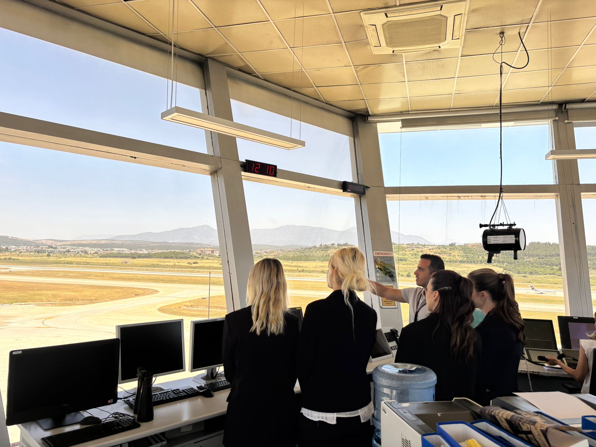 Hava Trafik Kontrolörleri Sertan PEKEL ve Jale ACAROĞLU tarafından Seyrüsefer eğitim odasında Hava Trafik Kontrolörlüğü ile ilgili kısa bilgilendirme yaparak, öğrencilerimize Yaklaşma Kontrol ve Meydan Kontrol Kulesi’nde uçakların iniş ve kalkış işlemleri, havalimanına yaklaşmaları sırasında uygulanan uygulamaları direk hava üssü radarları üzerinden deneyimleme fırsatı sunmuşlardır. Ayrıca Meydan Kontrol Kulesi’ inde öğrencilerimiz, uçakların iniş ve kalkışını, pushback ve taksi hareketlerini en önemli ve en üst noktadan izlemişlediler ve Meydan Kontrol Kulesi’nden Havalimanı, pist, apron, taxiway bölümlerini yerinde görme fırsatı buldular.