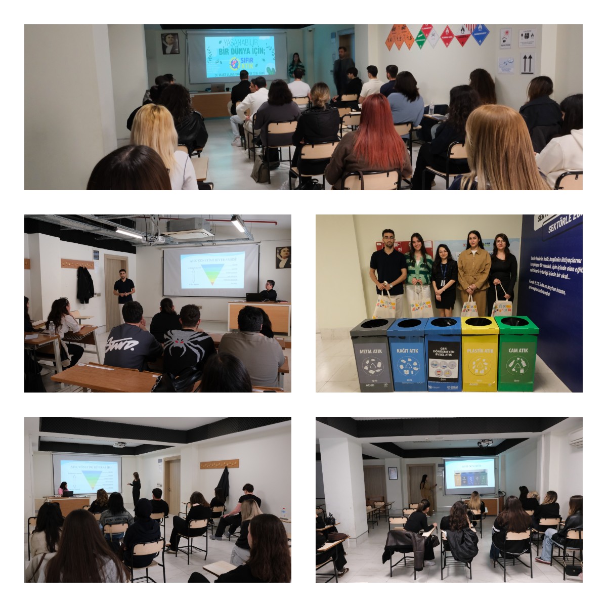 30 Mart Uluslararası Sıfır Atık Günü kapsamında, kurum genelinde çevre bilincini artırmaya yönelik anlamlı bir etkinlik gerçekleştirildi. Çevre Sağlığı ve Çevresel Risk Yönetimi Teknikerliği Programı öğrencileri tarafından düzenlenen eğitimde, farklı programlarda öğrenim gören öğrencilere sıfır atık uygulamaları ve geri dönüşüm süreçleri hakkında kapsamlı bilgilendirme yapıldı.