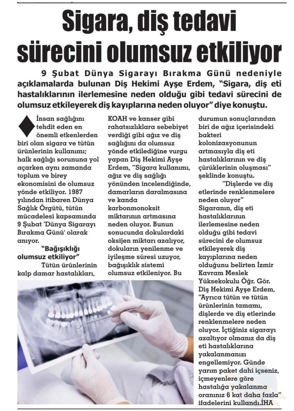 Sigara, diş tedavi sürecini olumsuz etkiliyor 9 Şubat Dünya Sigarayı Bırakma Günü nedeniyle açıklamalarda bulunan Diş Hekimi Ayşe Erdem, "Sigara, diş eti hastalıklarının ilerlemesine neden olduğu gibi tedavi sürecini de olumsuz etkileyerek diş kayıplarına neden oluyor" diye konuştu. İnsan sağlığını tehdit eden en önemli etkenlerden biri olan sigara ve tütün ürünlerinin kullanımı; halk sağlığı sorununa yol açarken aynı zamanda toplum ve birey ekonomisini de olumsuz yönde etkiliyor. 1987 yılından itibaren Dünya Sağlık Örgütü, tütün mücadelesi kapsamında 9 Şubat 'Dünya Sigarayı Bırakma Günü1 olarak anıyor. "Bağışıklığı olumsuz etkiliyor" Tütün ürünlerinin kalp damar hastalıkları. KOAH ve kanser gibi rahatsızlıklara sebebiyet verdiği gibi ağız ve diş sağlığını da olumsuz yönde etkilediğine vurgu yapan Diş Hekimi Ayşe Erdem, "Sigara kullanımı, ağız ve diş sağlığı yönünden incelendiğinde, damarların daralmasına ve kanda karbonmonoksit miktarının artmasına neden oluyor. Bunun sonucunda dokulardaki oksijen miktarı azalıyor, dokuların yenilenme ve iyileşme süresi uzuyor, bağışıklık sistemi olumsuz etkileniyor. Bu durumun sonuçlarından biri de ağız içerisindeki bakteri kolonizasyonunun artmasıyla diş eti hastalıklarının ve diş çürüklerinin oluşması" şeklinde konuştu. "Dişlerde ve diş etlerinde renklenmelere neden oluyor" Sigaranın, diş eti hastalıklarının ilerlemesine neden olduğu gibi tedavi sürecini de olumsuz etkileyerek diş kayıplarına neden olduğunu belirten İzmir Kavram Meslek Yüksekokulu Öğr. Gör. Diş Hekimi Ayşe Erdem, "Ayrıca tütün ve tütün ürünlerinin tamamı, dişlerde ve diş etlerinde renklenmelere neden oluyor. İçtiğiniz sigarayı azaltıyor olmanız da diş eti hastalıklarına yakalanmanızı engellemiyor. Günde yarım paket dahi içseniz, içmeyenlere göre hastalığa yakalanma oranınız 6 kat daha fazla" ifadelerini kullandı.