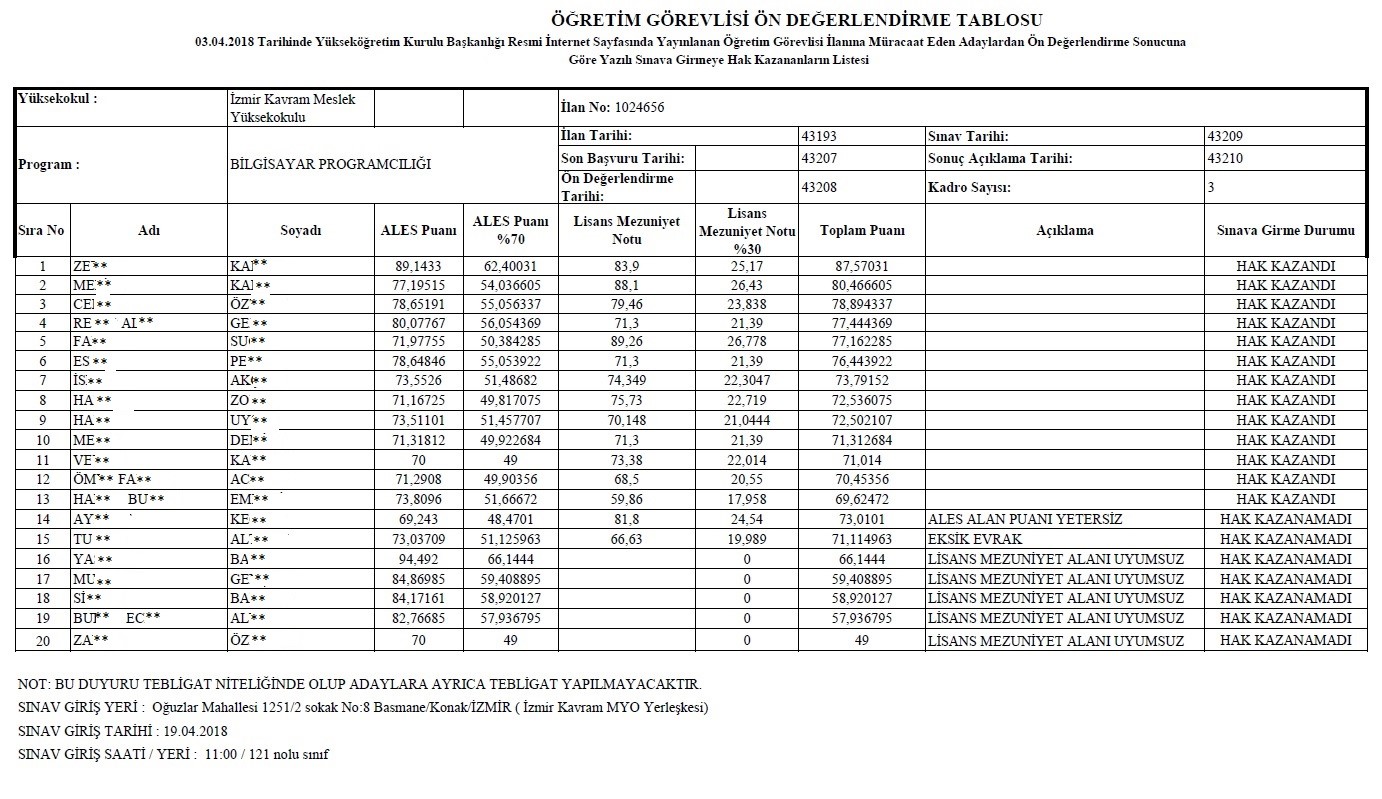 03.04.2018 Tarihli 1024656 İlan Nolu Bilgisayar Programcılığı Programı Öğretim Görevlisi Alım İlanının Ön Değerlendirmesidir.