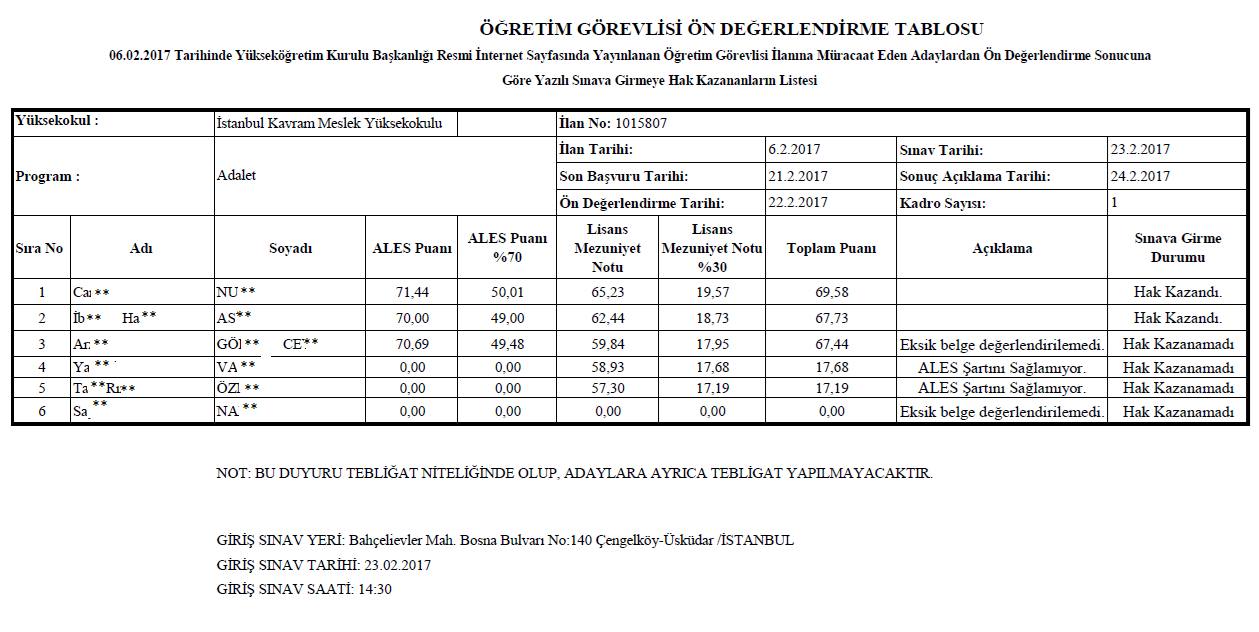 06.02.2017 Tarihli 1015807 İlan Nolu Öğretim Elemanı Alım İlanının Ön Değerlendirmesi Hk.