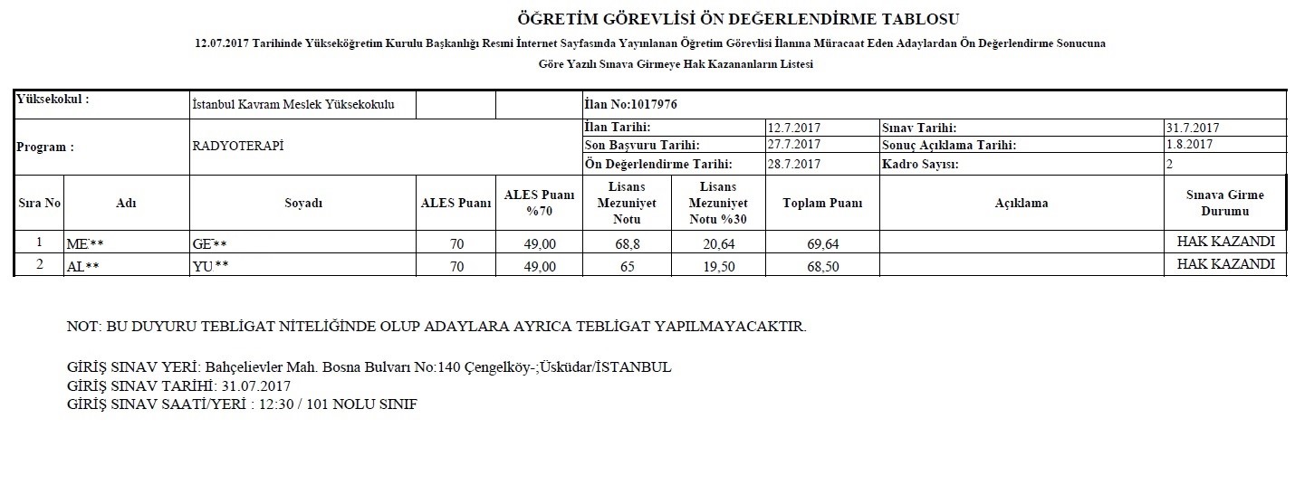12.07.2017 Tarihli 1017976 İlan Nolu Öğretim Elemanı Alım İlanının Ön Değerlendirmesi Hk.