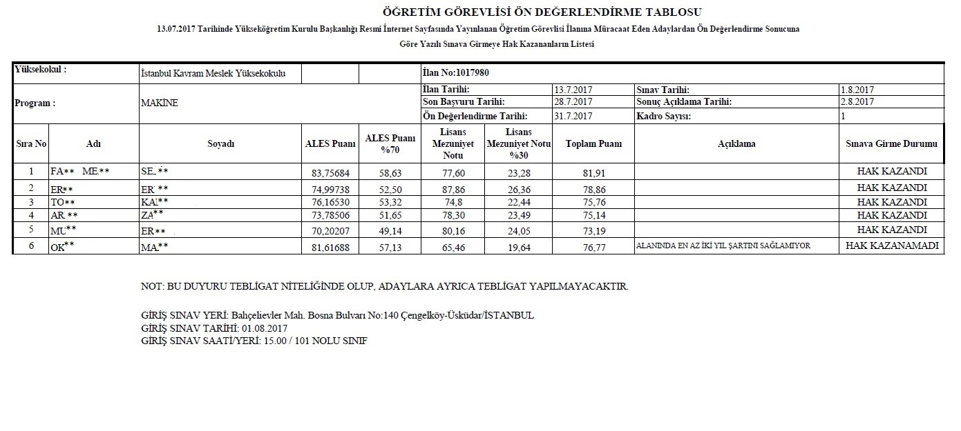 13.07.2017 Tarihli 1017980 İlan Nolu Öğretim Elemanı Alım İlanının Ön Değerlendirmesi Hk.