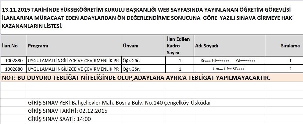 13.11.2015 Tarihli Öğretim Elemanı Alım İlanının Ön Değerlendirmesi Hk.