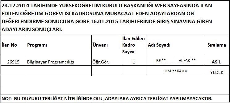 24.12.2014 tarihinde Yükseköğretim Kurulu Başkanlığı web sayfasında ilan edilen öğretim görevlisi kadrosuna müracaat eden adaylardan ön değerlendirme sonucuna göre 16.01.2015 tarihlerinde giriş sınavına giren adayların sonuçları: