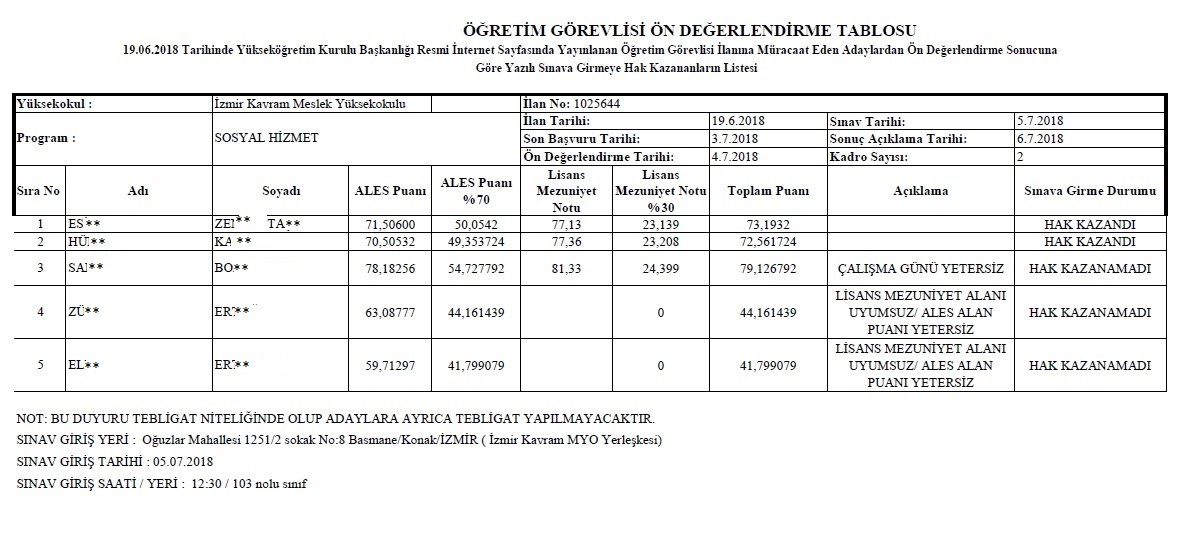19.06.2018 Tarihli 1025644 İlan Nolu Sosyal Hizmetler Programı Öğretim Görevlisi Alım İlanının Ön Değerlendirmesi Hk.
