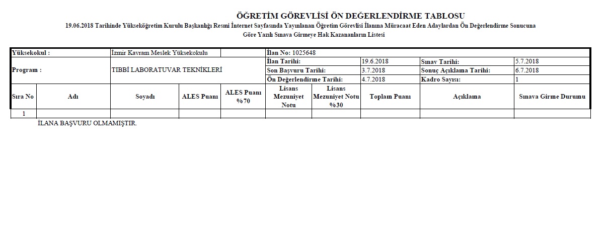 19.06.2018 Tarihli 1025648 İlan Nolu Tıbbi Laboratuvar Teknikleri Programı Öğretim Görevlisi Alım İlanının Ön Değerlendirmesi Hk.