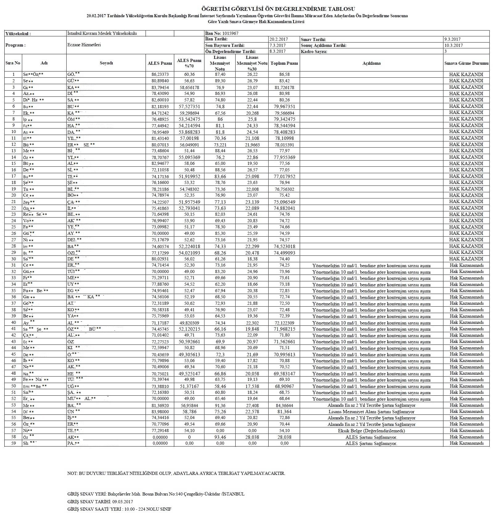 20.02.2017 Tarihli 1015967 İlan Nolu Öğretim Elemanı Alım İlanının Ön Değerlendirmesi Hk.