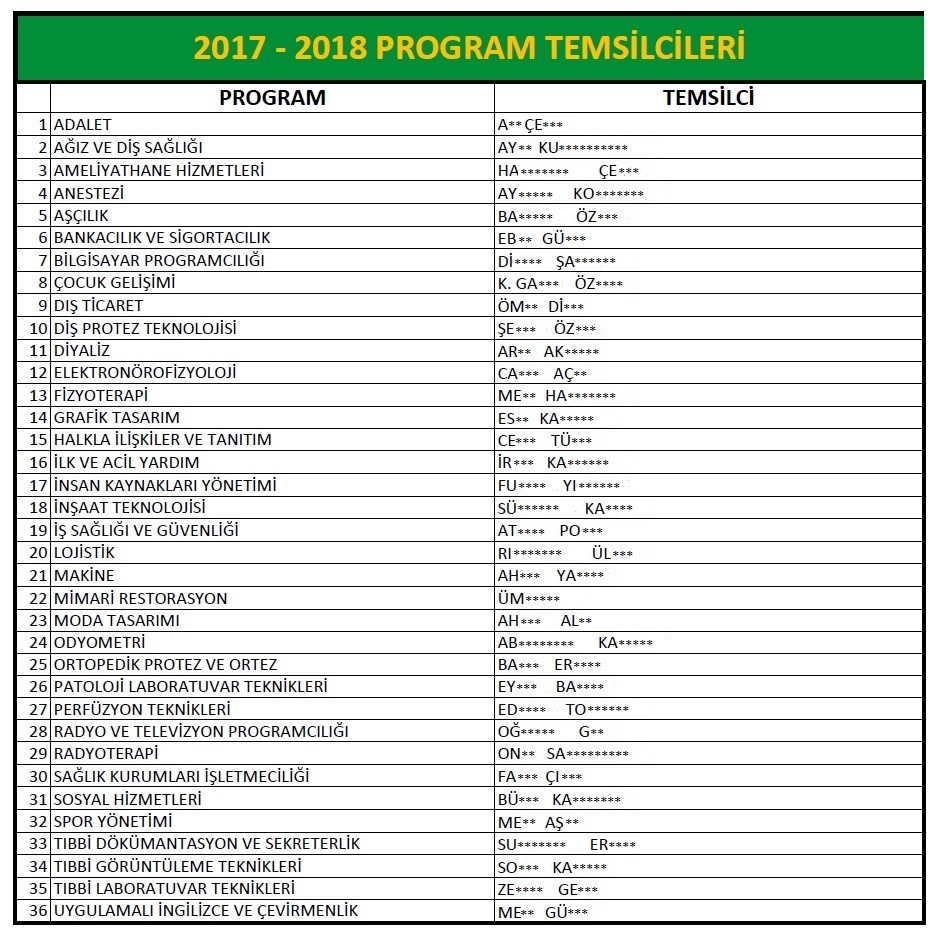 Öğrenci Program Temsilciliğini yürütecek Öğrenci Konseyi Genel Kurul Üyeleri aşağıdaki tabloda belirtilmiştir.