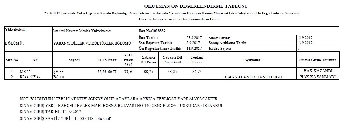 23.08.2017 Tarihli 1018889 İlan Nolu Yabancı Diller ve Kültürler Bölümü Okutmanlık Alım İlanının Ön Değerlendirmesi Hk.