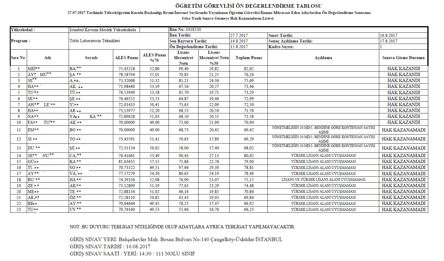 27.07.2017 Tarihli 1018230 İlan Nolu Öğretim Elemanı Alım İlanının Ön Değerlendirmesi Hk.