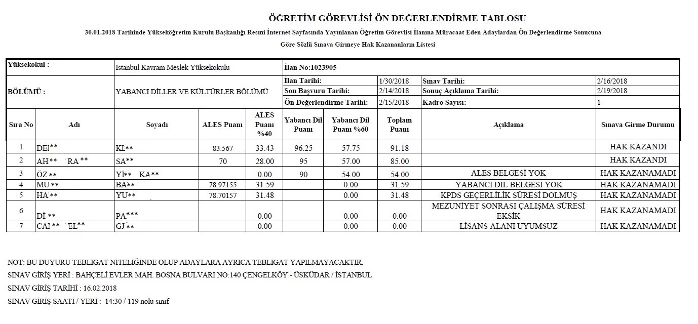 30.01.2018 Tarihli 1023905 İlan Nolu Uygulamalı İngilizce ve Çevirmenlik Programı Öğretim Görevlisi Alım İlanının Ön Değerlendirmesi Hk.