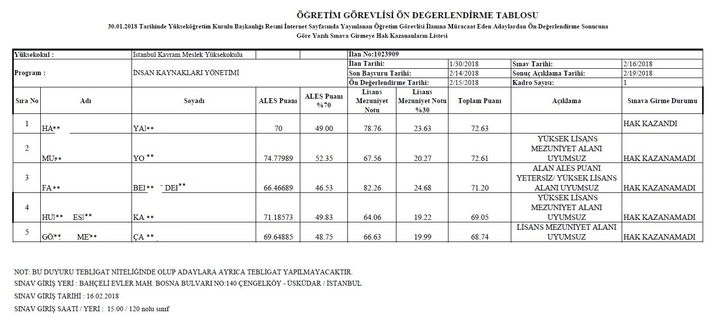 30.01.2018 Tarihli 1023909 İlan Nolu İnsan Kaynakları Yönetimi Programı Öğretim Görevlisi Alım İlanının Ön Değerlendirmesi Hk.
