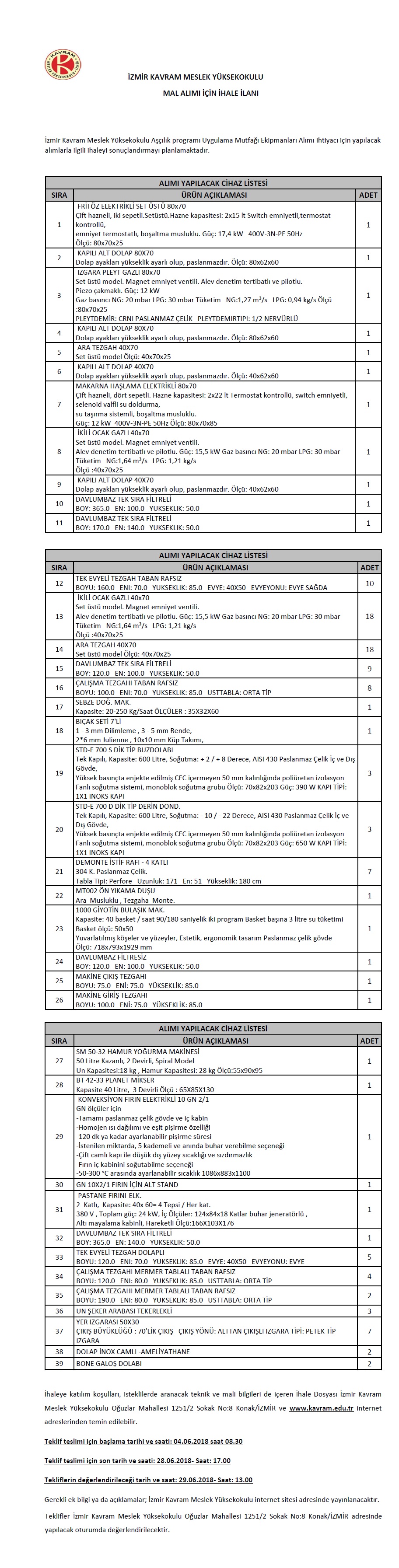 Aşçılık programı Uygulama Mutfağı Ekipmanları Alımı İhalesi Hk. (08.06.2018)