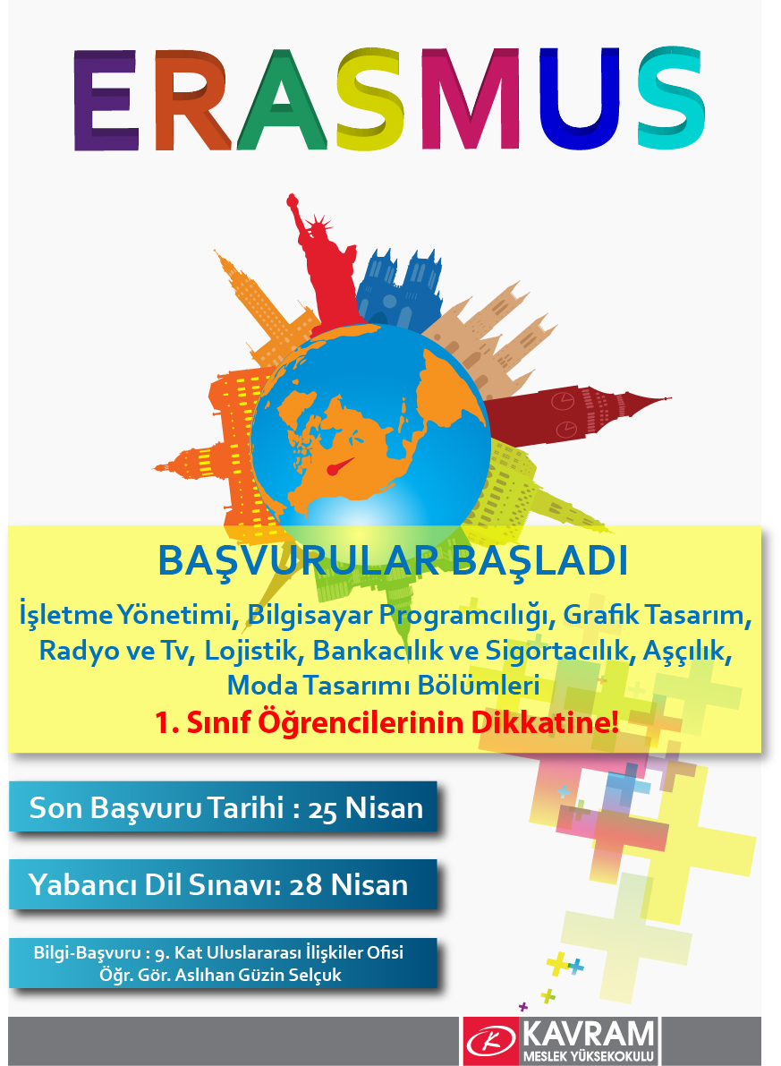 Erasmus'a İşletme Yönetimi, Bilgisayar Programcılığı, Grafik Tasarım, Radyo ve TV, Lojistik, Bankacılık ve Sigortacılık, Aşçılık, Moda Tasarımı Bölümü programları 1. sınıf öğrencileri başvuruda bulunabilecektir.