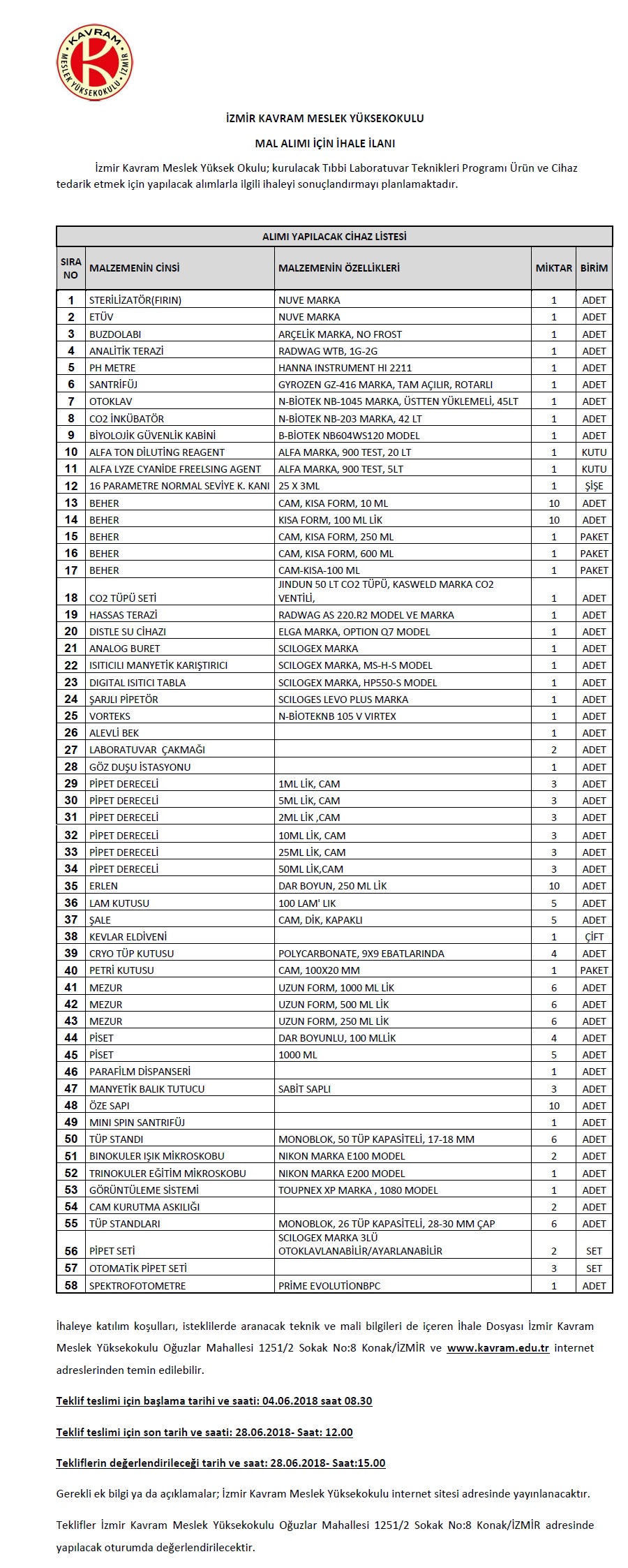 Tıbbi Laboratuvar Teknikleri Programı Ürün ve Cihaz Tedarik edilmesi İhalesi Hk.