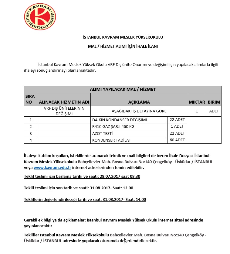 VRF Dış Ünite Onarımı Ve Değişimi İçin Yapılacak İhale Hk. (28.07.2017)