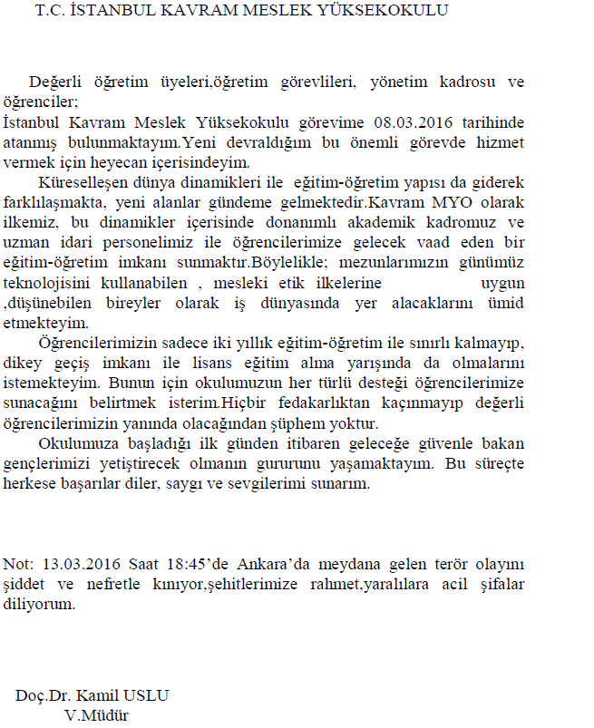 İstanbul Kavram Meslek Yüksekokulu görevime 08.03.2016 tarihinde atanmış bulunmaktayım. Yeni devraldığım bu görevde hizmet etmek için heyecan içerisindeyim.
