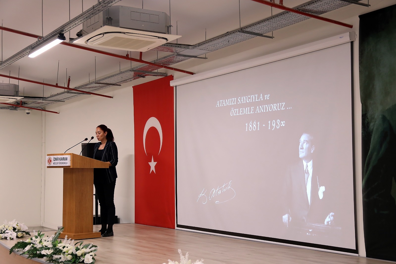 10 Kasım Pazar günü saatler 09:05'i gösterdiğinde saygı duruşu ve İstiklal Marşı ile başlayan törenimiz, Halkla İlişkiler Programı Öğr. Gör. Oya Altar Yavuz'un 'Atatürk, Eğitim ve Bilim' başlıklı konuşmasıyla devam etti.