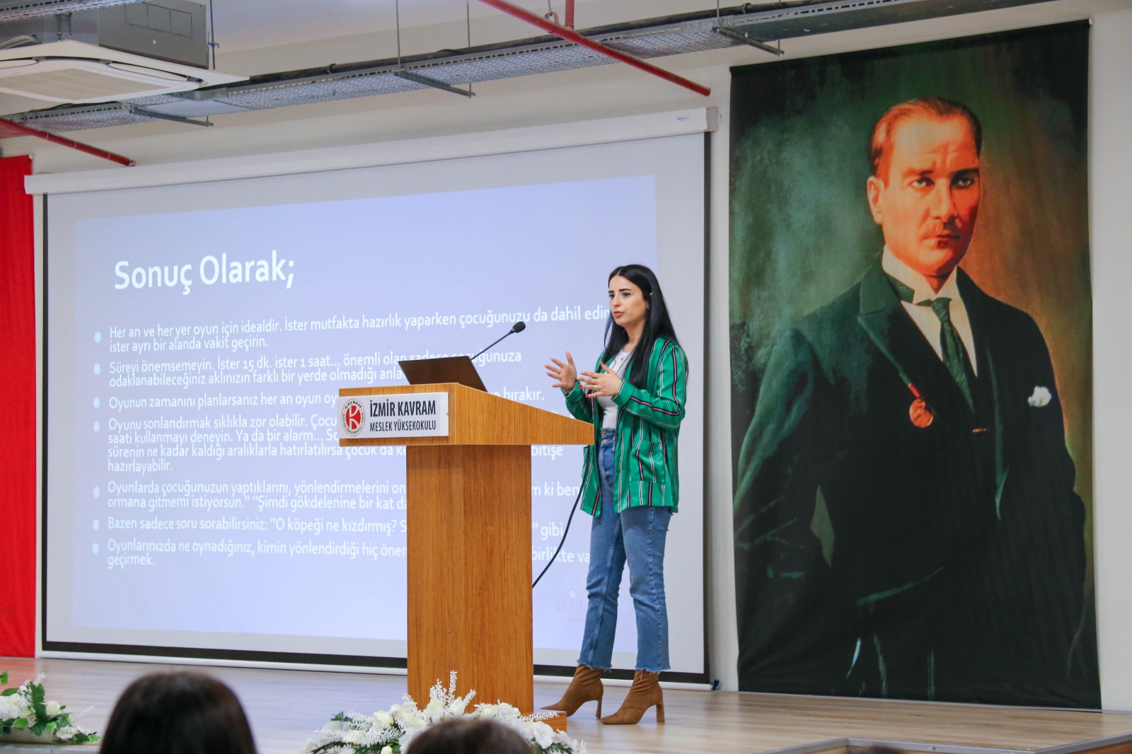 Fulden KARAYILAN. “Çocuğun İletişim Dili: Oyun” konulu sunumu ile oyunun çocuğun gelişimi ve eğitimindeki önemi üzerine bilgilendirmeler gerçekleştirmiştir. Söz konusu söyleyişi ile Çocuk Gelişimi Programı öğrencileri çocuğa rehberlik etme sürecinin bileşenleri hakkında bilinçlenme fırsatı bulmuşlardır.
