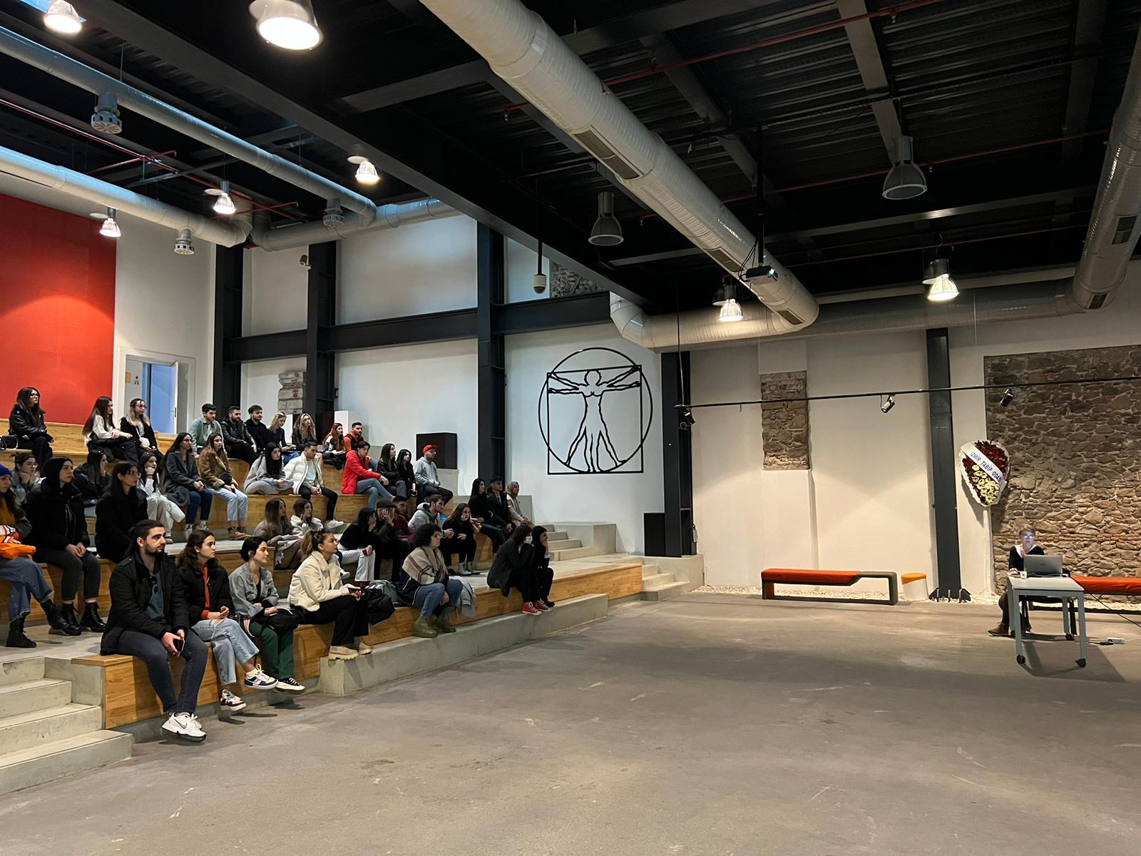2022-2023 Akademik Yılı Güz Kariyer dönemi etkinlikleri kapsamında İç Mekan Tasarımı Programı 1. ve 2. sınıf öğrencilerimiz ile Mimarlar Odası İzmir Şubesi'nin hizmet binası olarak kullanılan İzmir Mimarlık Merkezi'ne teknik gezi gerçekleştirildi. Merkezi mekansal olarak deneyimleyen öğrencilerimiz Y. Mimar Çiçek TEZER'in "Bir tasarımcının kariyer deneyimleri" isimli sunumuna katıldı. Öğrencilerin profesyonel hayata adım attıklarında karşılaşacakları fırsatların detaylandırıldığı sunumda Y. Mimar Çiçek TEZER, bir tasarımcı olarak kişisel kariyerindeki dönüm noktalarını anlattı. Bununla birlikte tasarımcıların kolektif çalışmalar içerisinde yer alacağı süreçleri de gerçekleştirdiği uygulamalar üzerinden detaylandırdı.