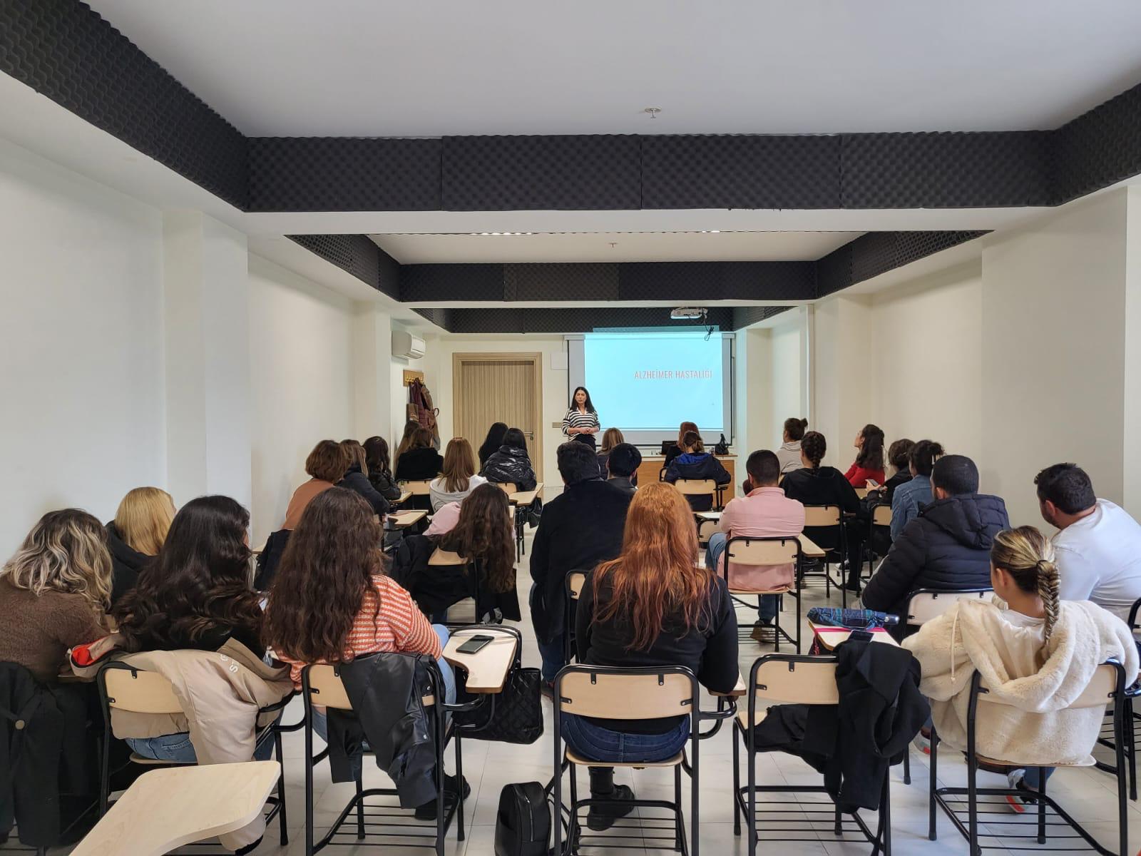 İzmir Kavram Meslek Yüksekokulu Sosyal Hizmetler Programı tarafından Kariyer Dönemi Etkinlikleri kapsamında “Yerel Yönetimlerde Yaşlılara Yönelik Hizmetler; Karşıyaka Belediyesi Gündüz Yaşam Merkezi Örneği” isimli etkinlik, merkezde görevli Sosyal Hizmet Uzmanı Hazal Bayram Efe’nin katılımıyla gerçekleştirildi. Program öğrencilerinin yoğun ilgiyle takip ettiği etkinlikte; Karşıyaka Belediyesi tarafından, Türkiye Alzheimer Derneği İzmir Şubesi ve Ege Geriatri Derneği iş birliğinde yeni açılmış olan ve Alzheimer hasta ve hasta yakınlarının yaşam kalitelerini artırmaya yönelik tıbbi, psikolojik ve sosyal hizmetlerin verildiği merkezde yürütülen çalışmalar paylaşıldı. Alzheimer konusunda farkındalık yaratmaya yönelik faaliyetler ile hasta yakınları, bakım verenler, sağlık ve bakım profesyonellerine yönelik eğitimlerin içeriklerine ilişkin bilgilendirmelerin ardından, gönüllü faaliyetler ve staj olanakları üzerine yapılan söyleşi sonrası öğrencilerimizle bilgi paylaşımında bulunan Sosyal Hizmet Uzmanı Hazal Bayram Efe’ye teşekkür belgesinin sunumu ile etkinlik sona erdi.