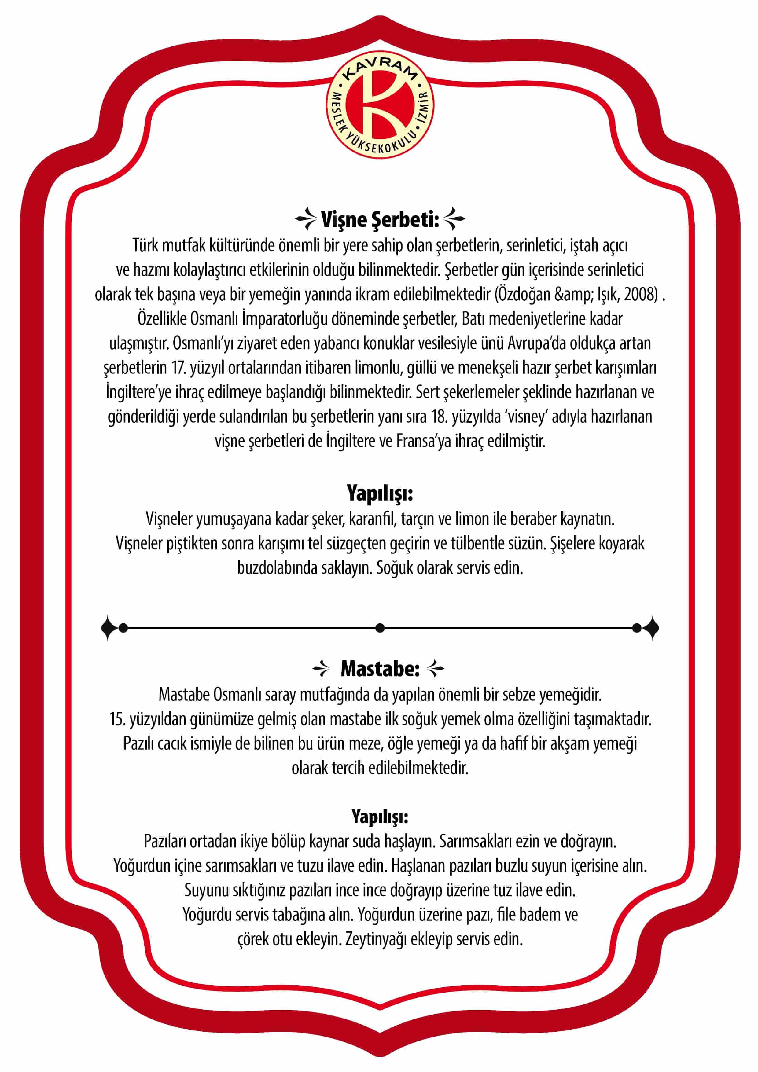 İzmir Valiliği tarafından, İzmir Kavram Meslek Yüksekokulu Aşçılık Programı akademisyenlerinin ve öğrencilerinin katılımıyla, bu sene ikincisi düzenlenen “Türk Mutfağı Haftası” açılış töreni İzmir Kültür ve Sanat Fabrikasında gerçekleşti. Açılış töreninde, Aşçılık Programı Öğr. Gör. Burcu Kaya ve Öğr. Gör. Onur Özden’in koordine ettiği program öğrencilerinin hazırladığı mastabe ve vişne şerbeti katılımcılara ikram edildi.