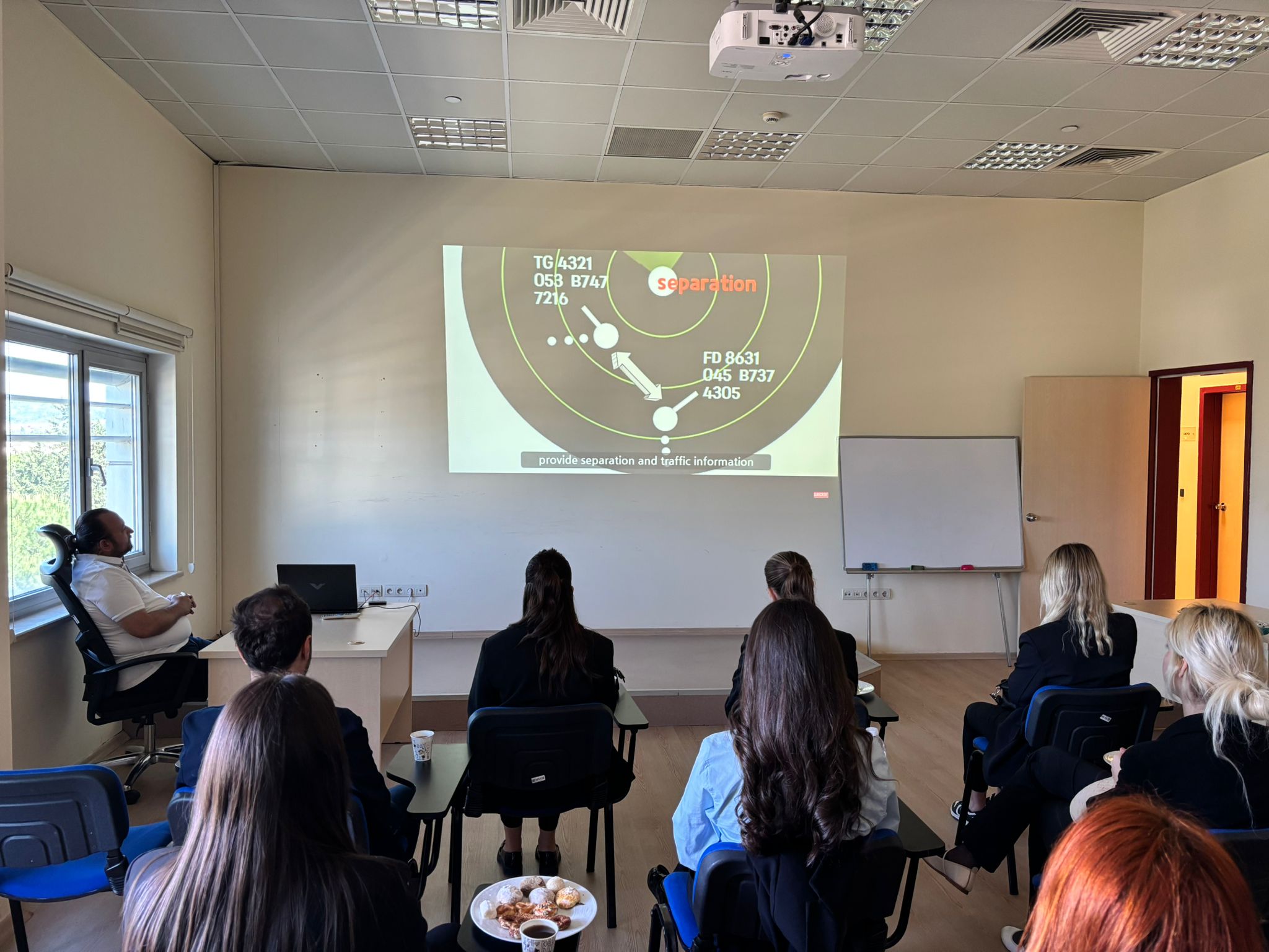 Hava Trafik Kontrolörleri Sertan PEKEL ve Jale ACAROĞLU tarafından Seyrüsefer eğitim odasında Hava Trafik Kontrolörlüğü ile ilgili kısa bilgilendirme yaparak, öğrencilerimize Yaklaşma Kontrol ve Meydan Kontrol Kulesi’nde uçakların iniş ve kalkış işlemleri, havalimanına yaklaşmaları sırasında uygulanan uygulamaları direk hava üssü radarları üzerinden deneyimleme fırsatı sunmuşlardır. Ayrıca Meydan Kontrol Kulesi’ inde öğrencilerimiz, uçakların iniş ve kalkışını, pushback ve taksi hareketlerini en önemli ve en üst noktadan izlemişlediler ve Meydan Kontrol Kulesi’nden Havalimanı, pist, apron, taxiway bölümlerini yerinde görme fırsatı buldular.