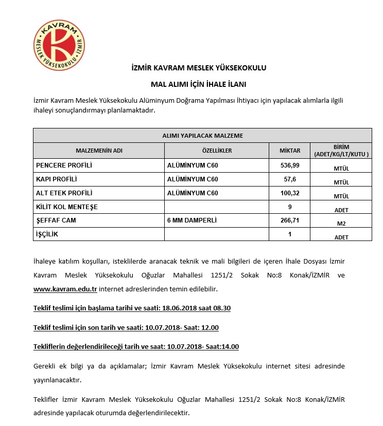 Alüminyum Doğrama Yapılması İhalesi Hk. (18.06.2018)